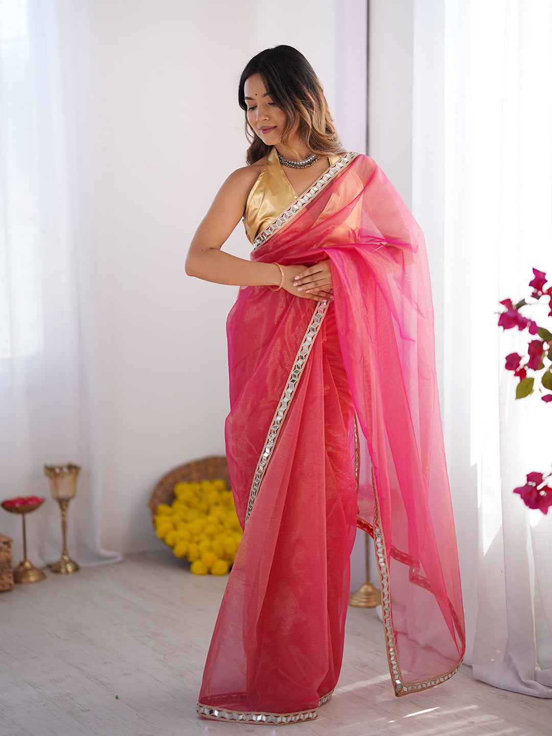 Pink Mirrorwork Organza Saree With Blouse Piece 98589