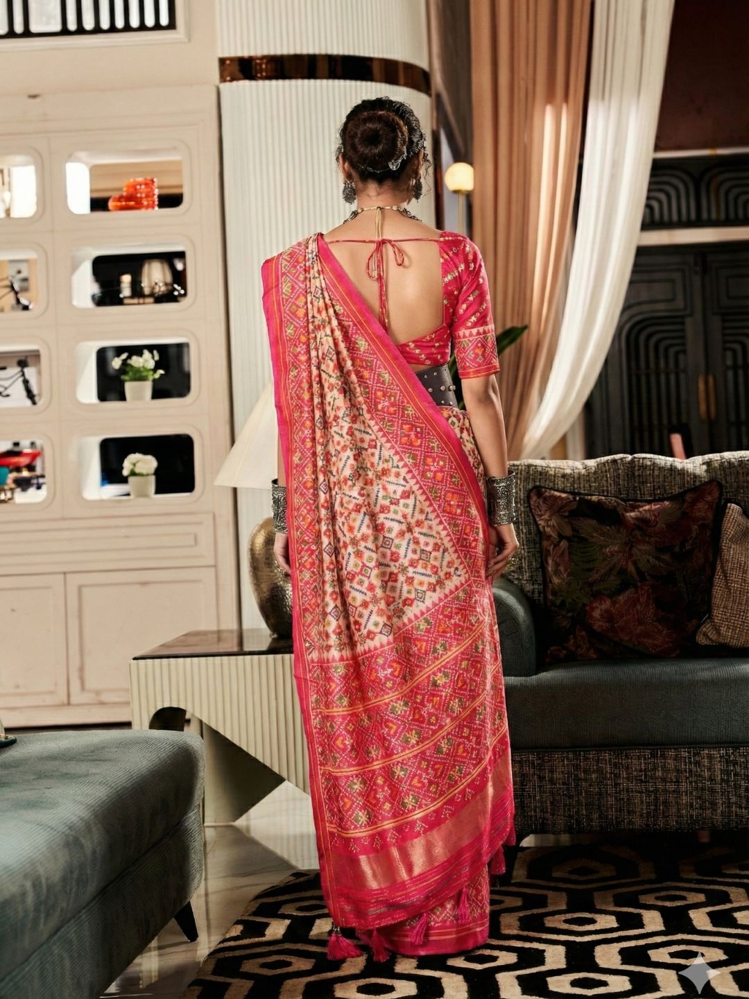 Pink White Pure Patola Silk Handloom Printed Saree With Blouse Piece 62870