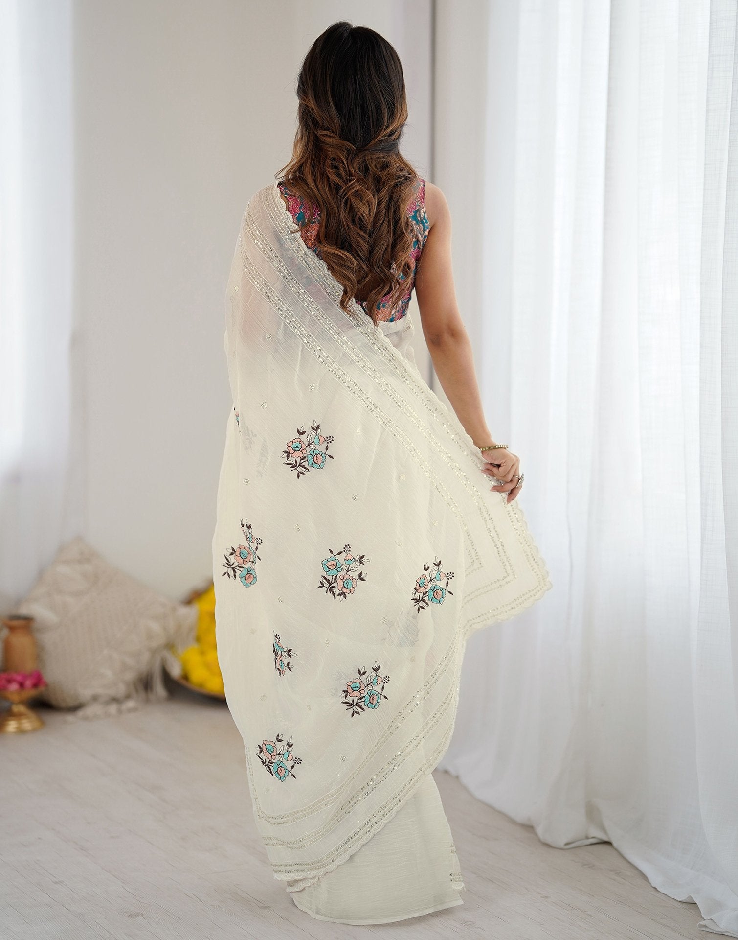 Premium Crush Organza Sarees With Self Sequins Weaving Pattern All Over The Sarees With Dori Arco Border Contrast Blouse 26022