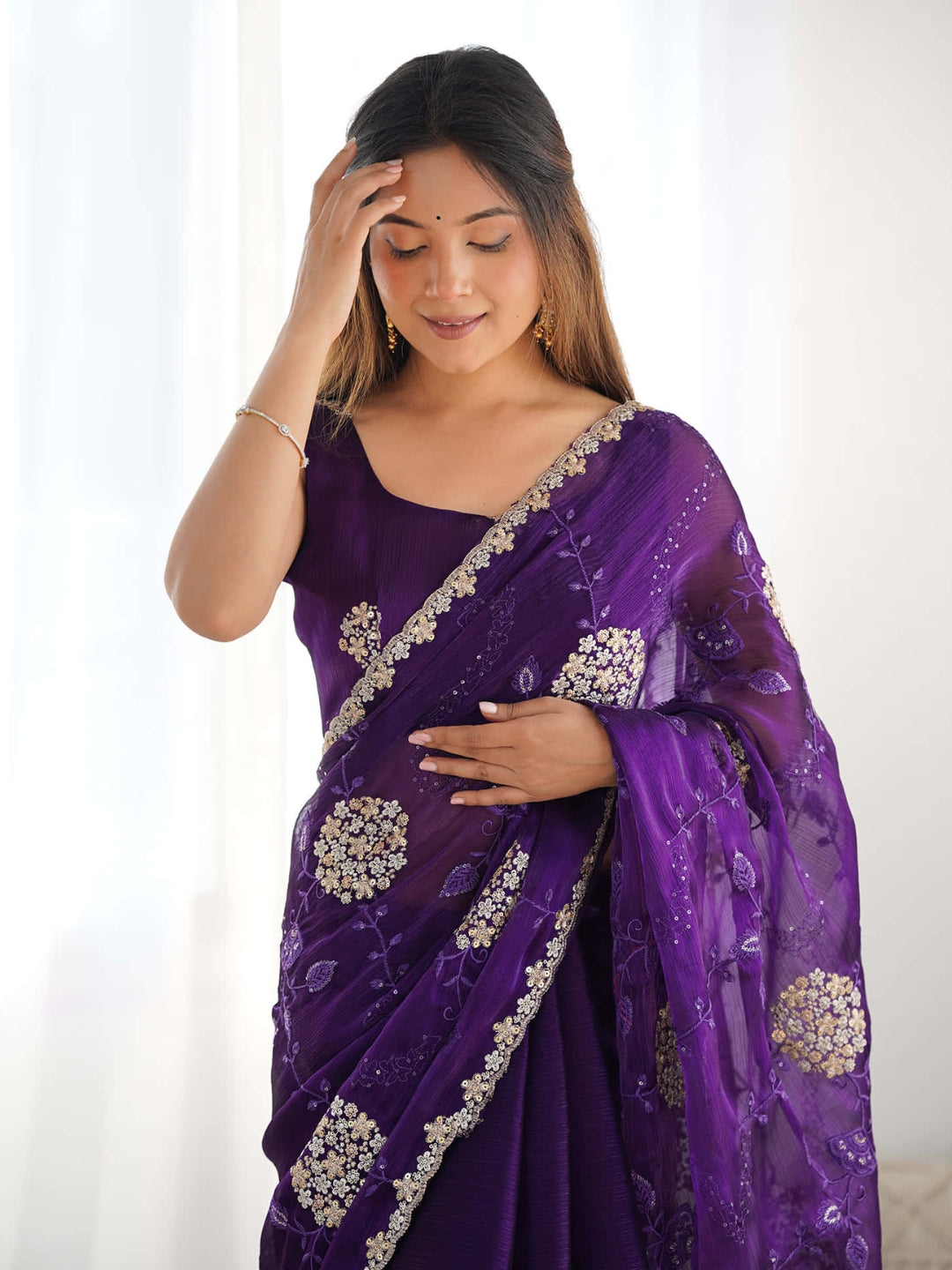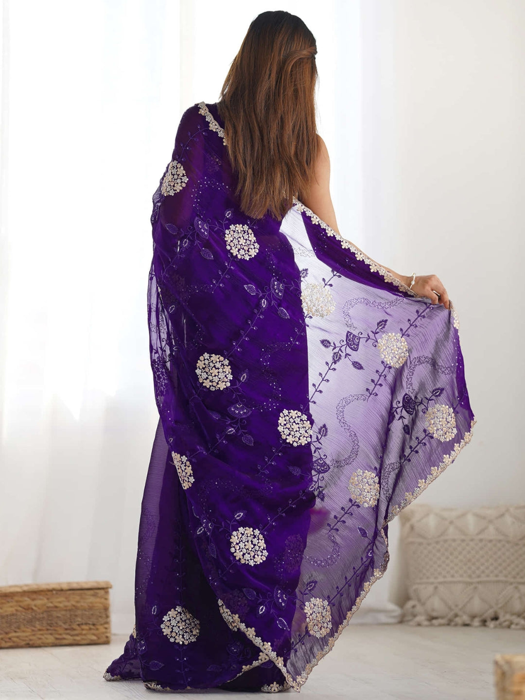 Pure Soft Blooming Jimmy Choo Chiffon Fabric With 3 Mm And 5 Mm Sequence With Double Zari And Thread Work 70278