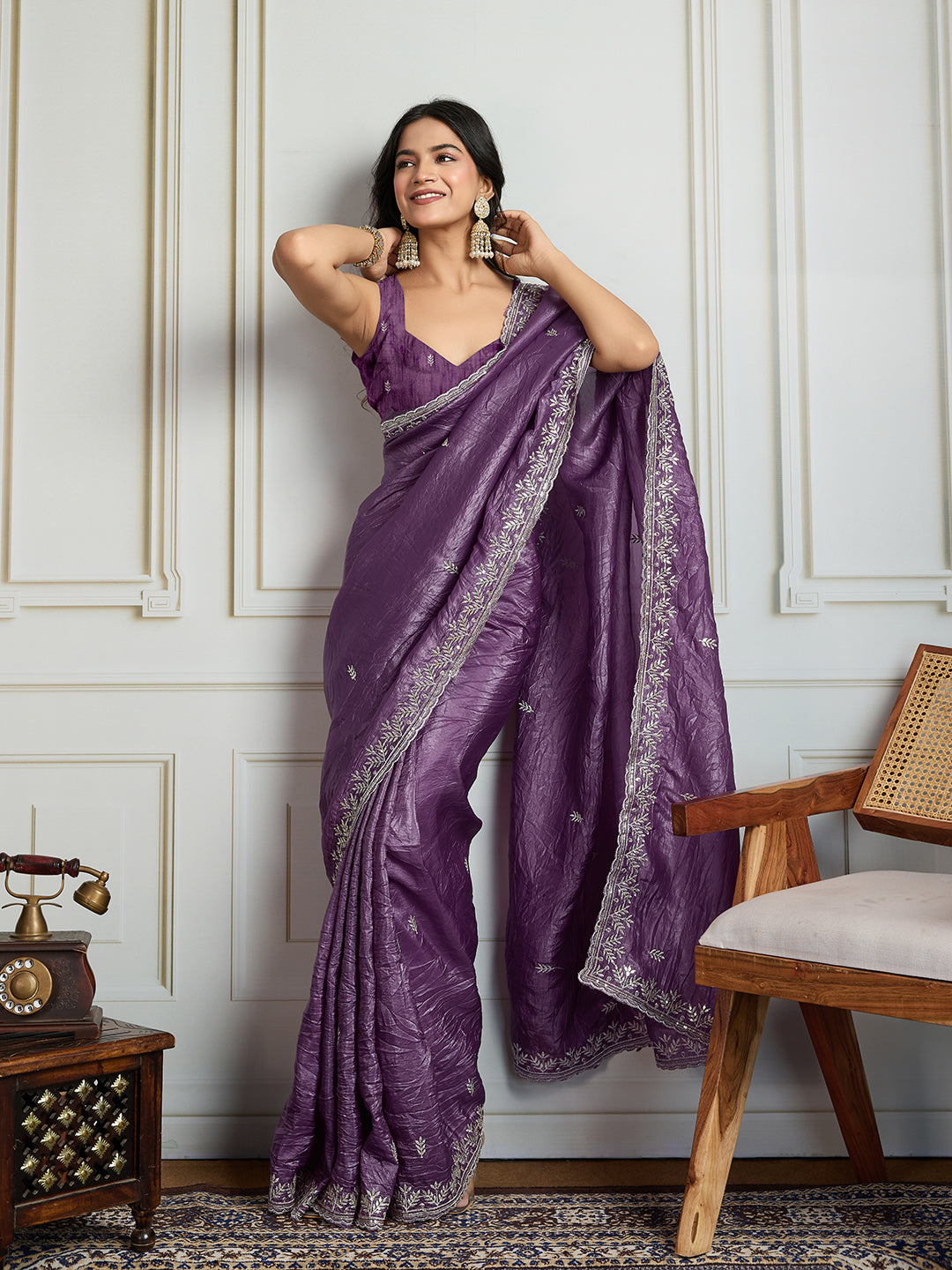 Purple Gold Crush Embroidered Designer Saree With Blouse 77311