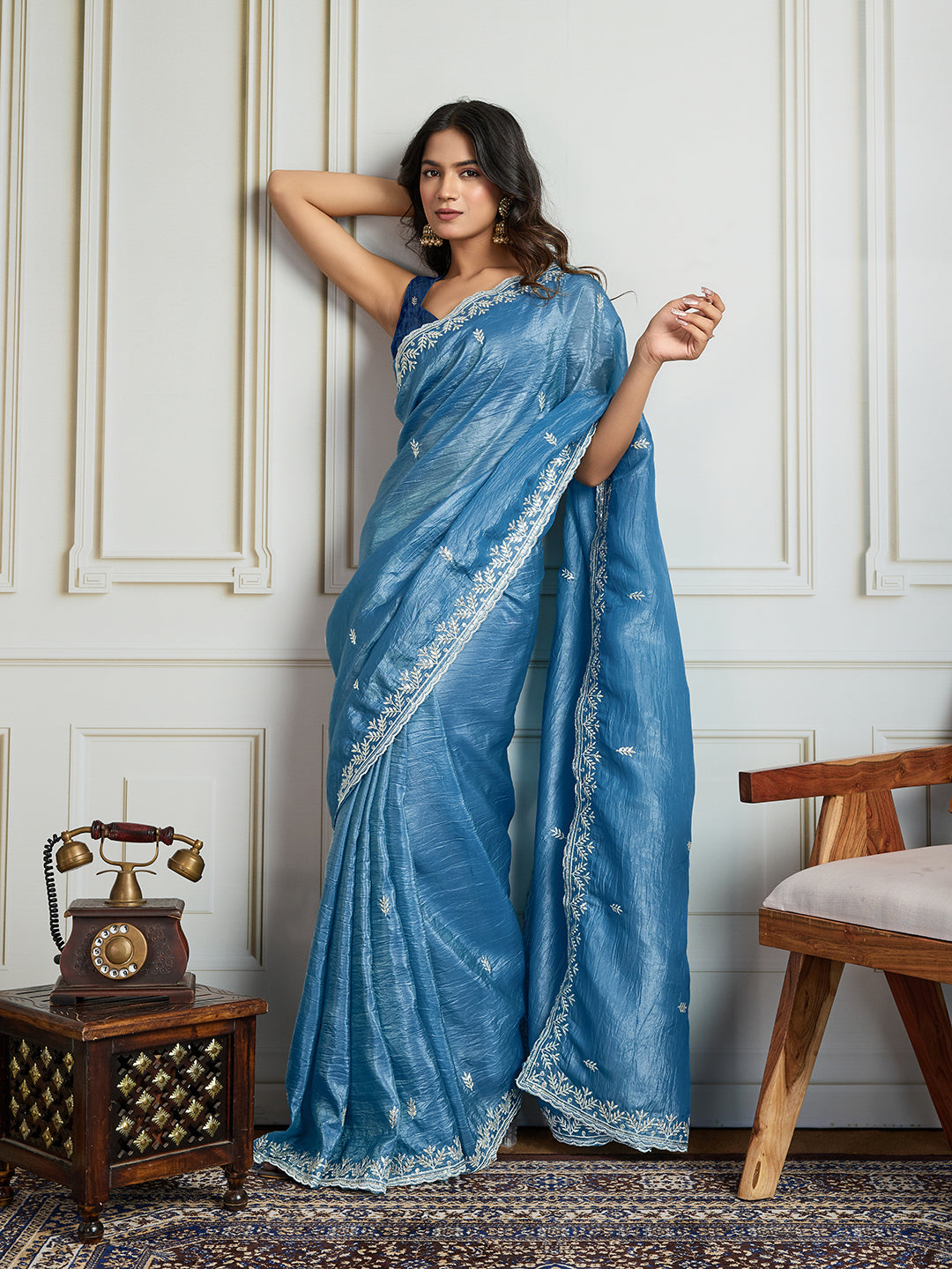 Rama Blue Gold Crush Embroidered Designer Saree With Blouse 66880
