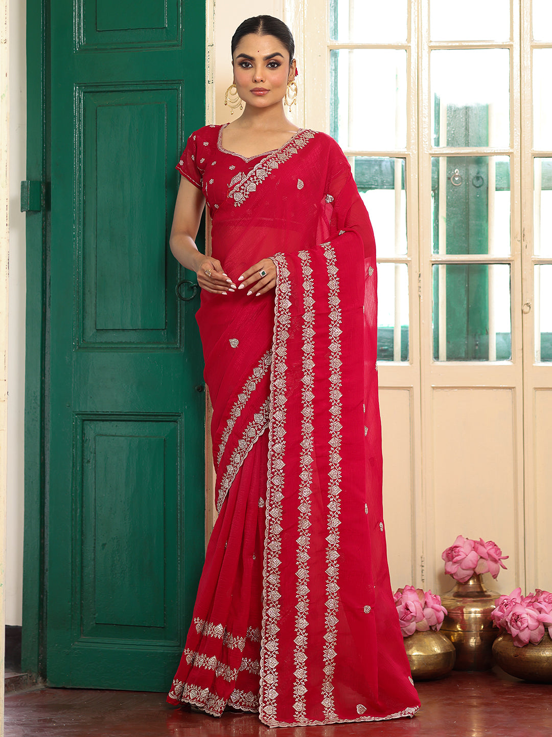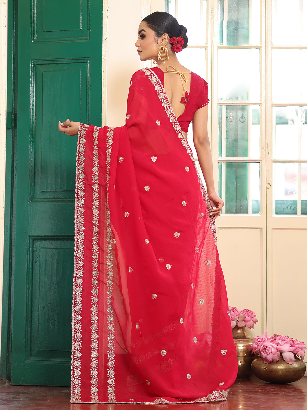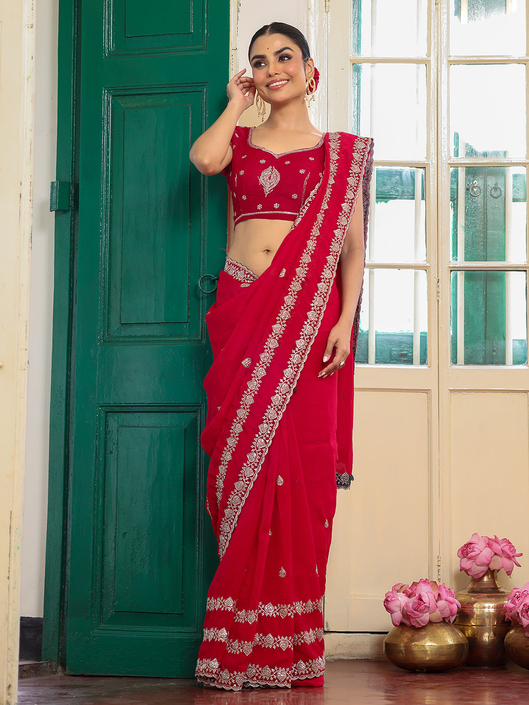 Red Embellished Embroidered Zari Satin Heavy Work Saree 69578