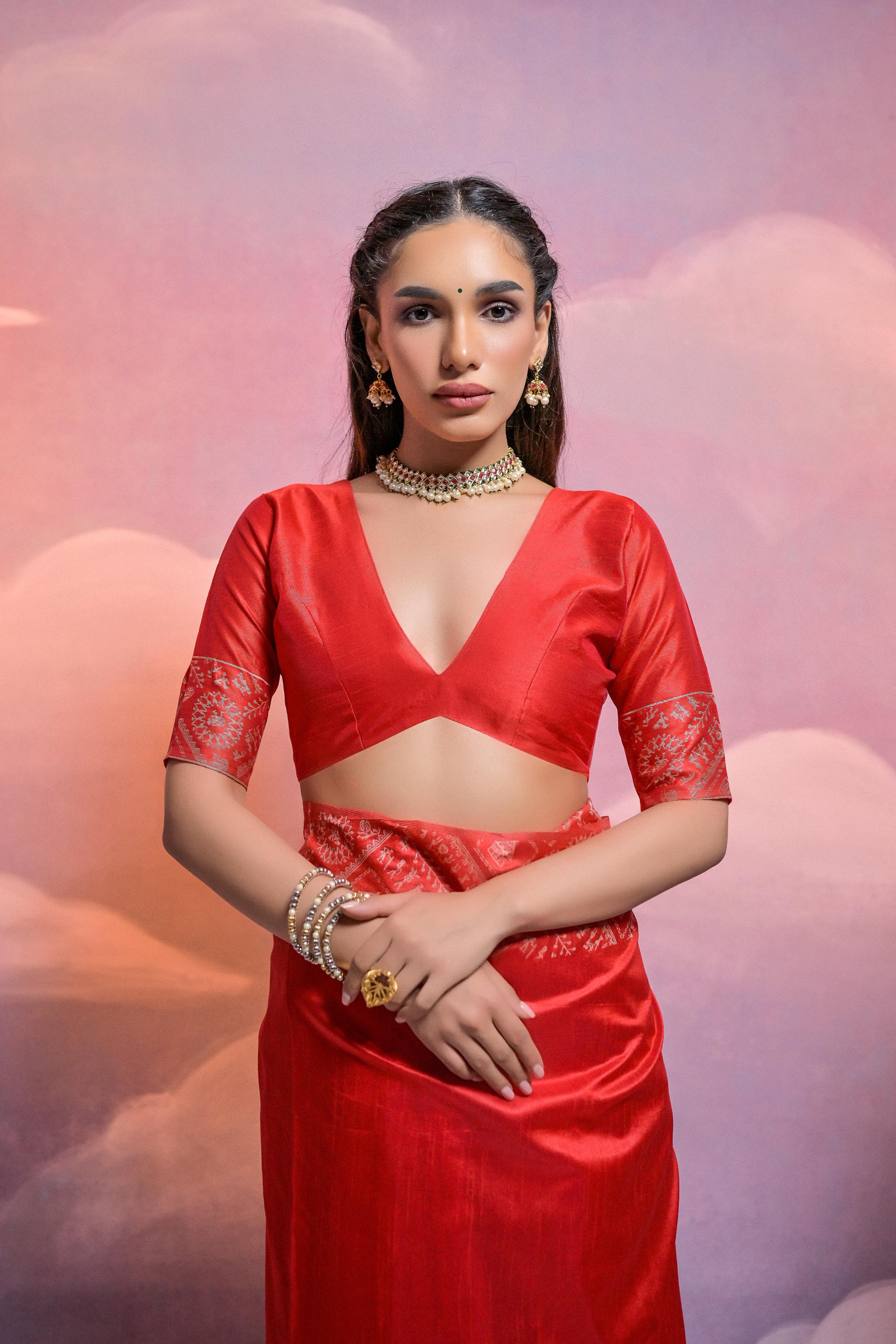 Red Handloom Raw Silk Weaving Designer Saree With Blouse 78032