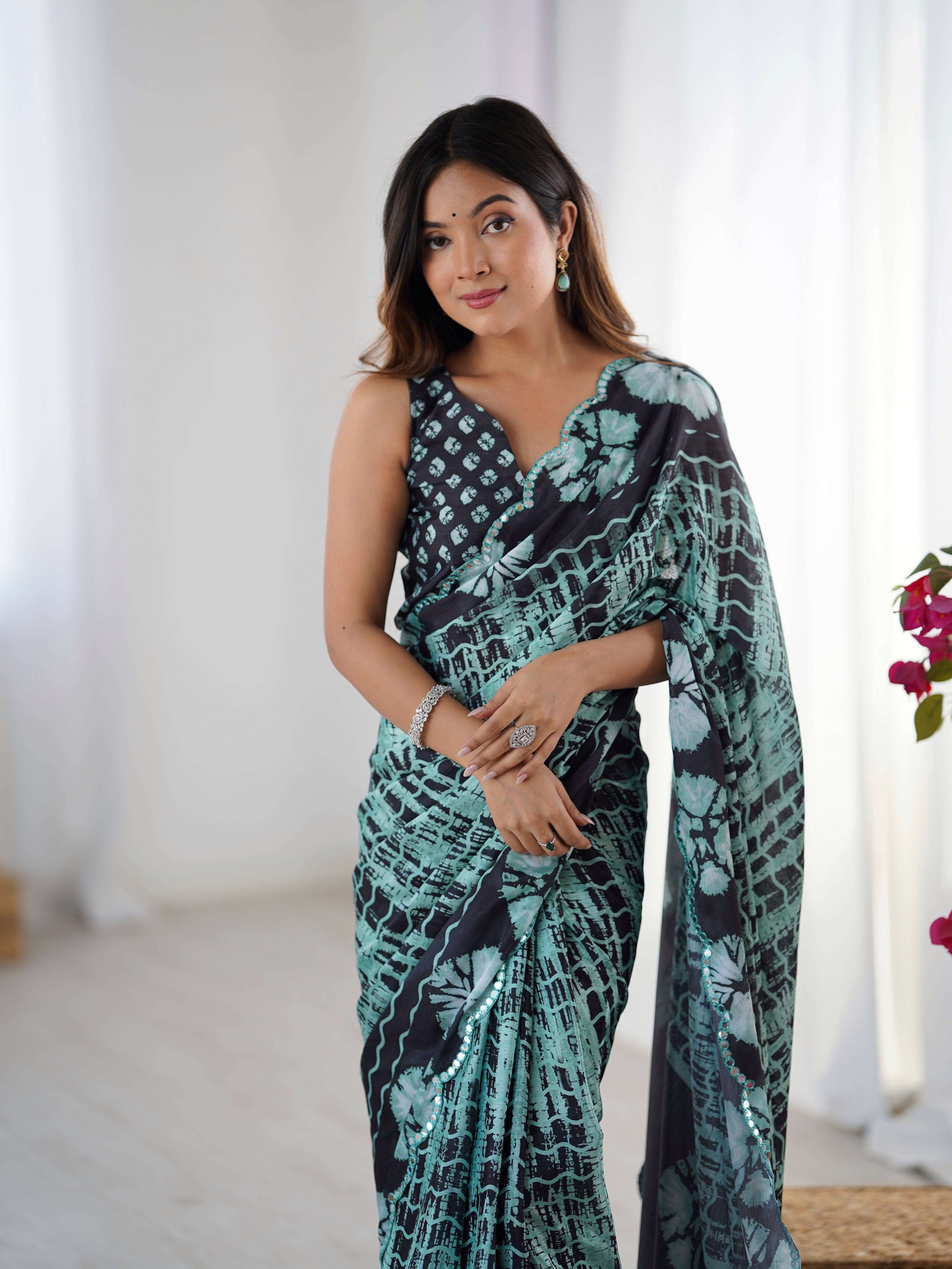 Sea Green Chinon Digital Printed Designer Saree With Blouse 64319