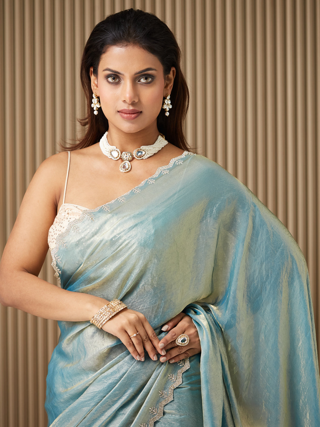 Turquoise Blue Satin Embellished Saree With Blouse Piece 98752
