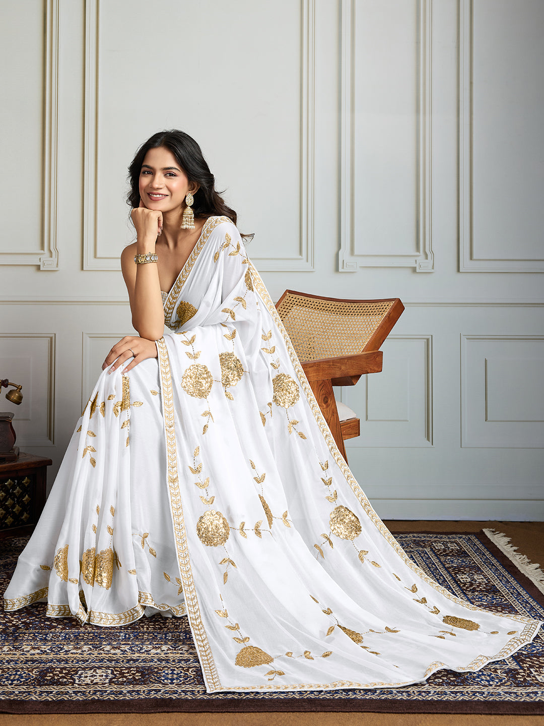 White Georgette Embroidered Designer Saree With Blouse 95409