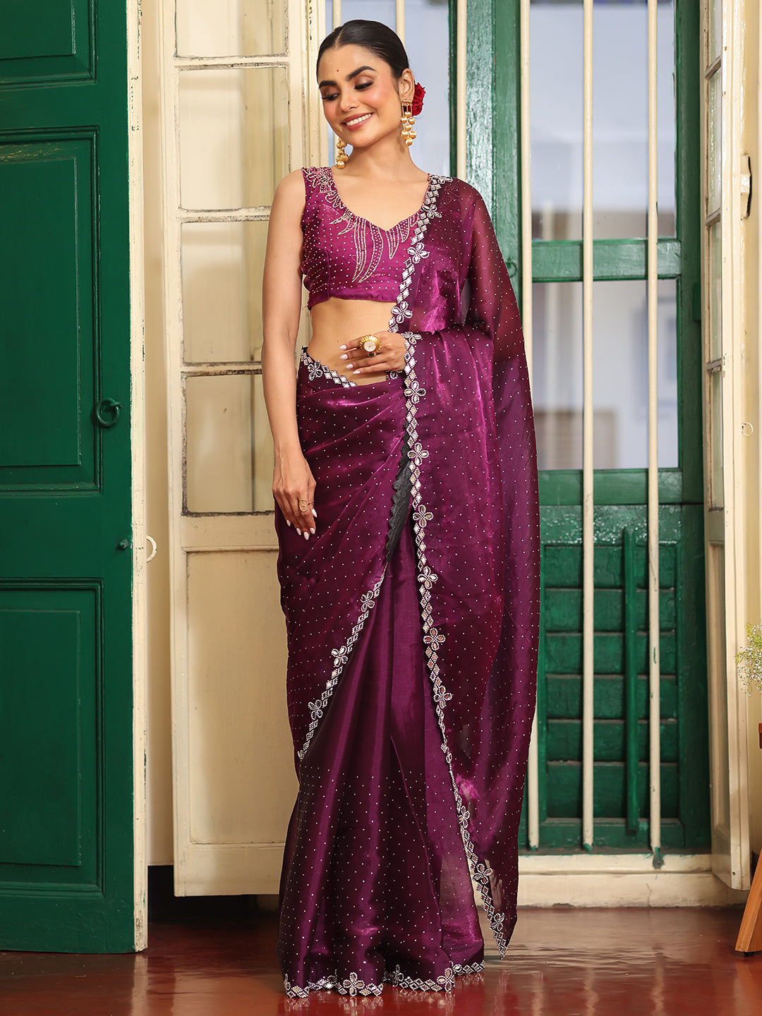 Wine Women Embellished Zari Organza Heavy Mirror Work Saree 44202