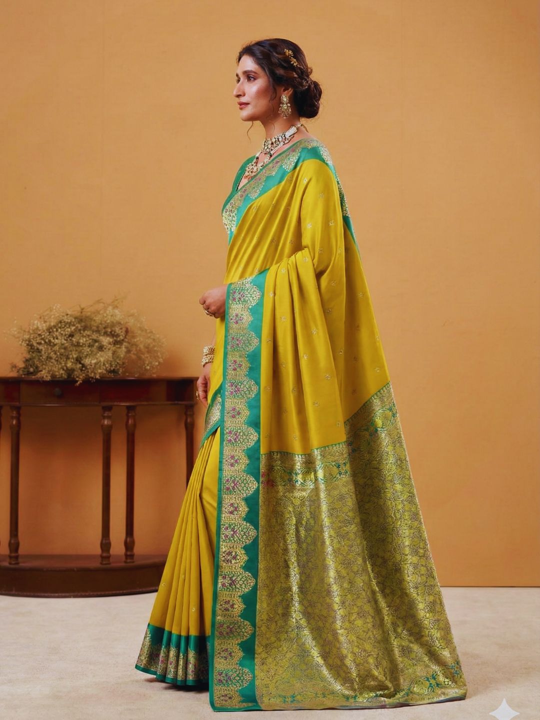 Yellow Soft Satin Silk Weaving Border With Gold Zari Silk Saree With Blouse Piece 86687